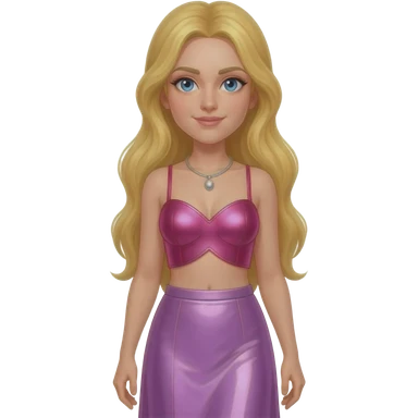 Aphrodite from Greek Mythology with blue eyes, long blonde hair, hot pink metallic sweetheart crop top, lavender pink metallic long skirt, silver necklace emoji
