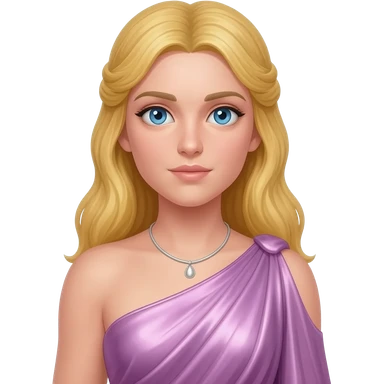Aphrodite from Greek Mythology with blue eyes, long golden blonde hair, lavender pink metallic one shoulder long dress, silver necklace emoji