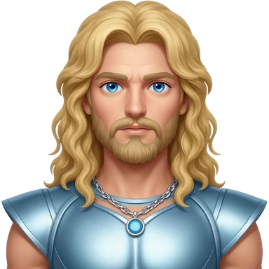 Zeus from Greek Mythology with blue eyes, long blonde hair, light steel blue metallic outfit, silver necklace emoji