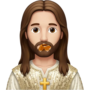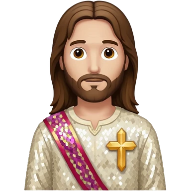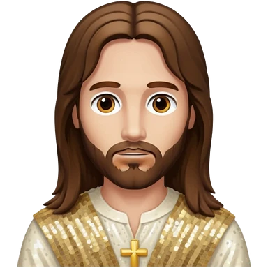 Jesus with long brown hair, ivory sequin baggy loincloth, shirtless with necklace emoji