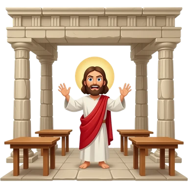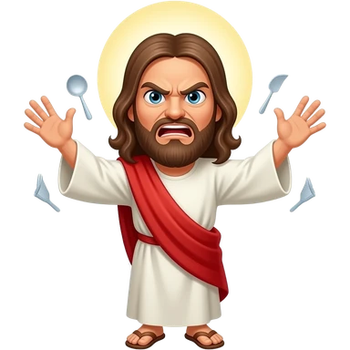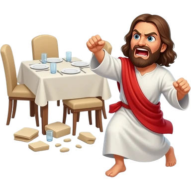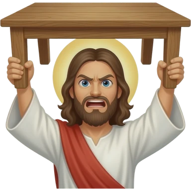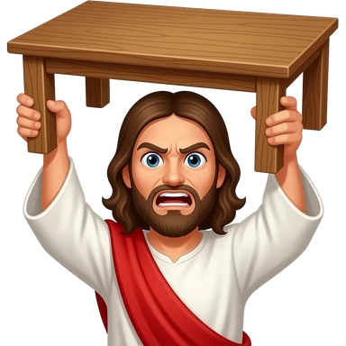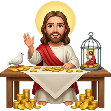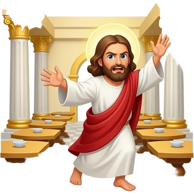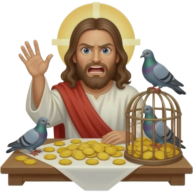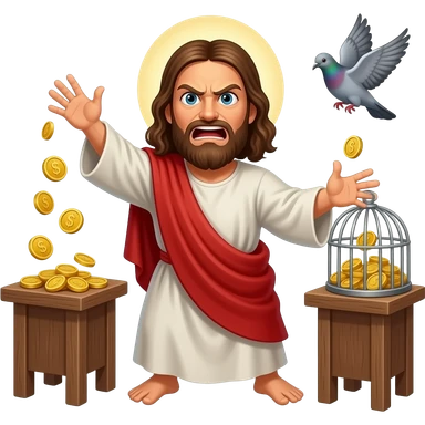 Jesus extremely mad and throwing tables with gold coins and caged doves emoji