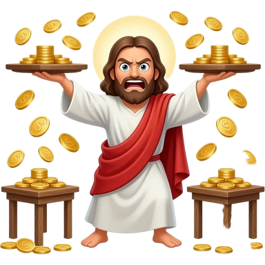 Jesus extremely mad throwing tables with gold coins tossed around emoji