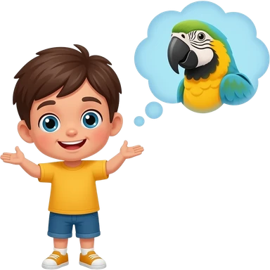 a shrugging kid with a thought bubble, thinking about a parrot emoji