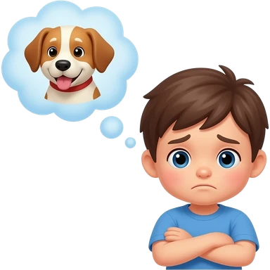 a shrugging kid with a thought bubble, thinking about a dog emoji