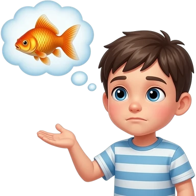 a shrugging kid with a thought bubble, thinking about a goldfish emoji