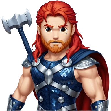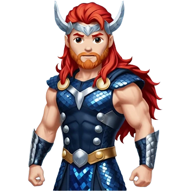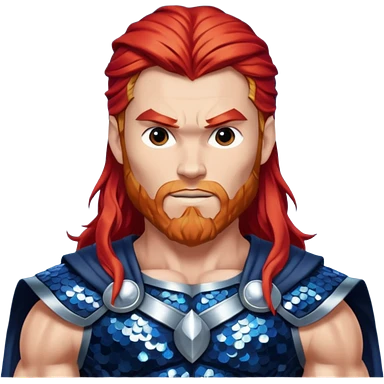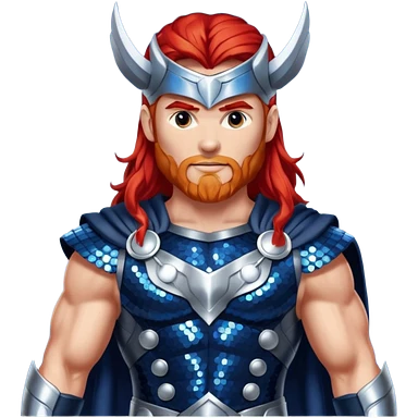 Thor, God of Thunder from Gods and Goddesses with long red hair, dark blue and silver sequin outfit emoji