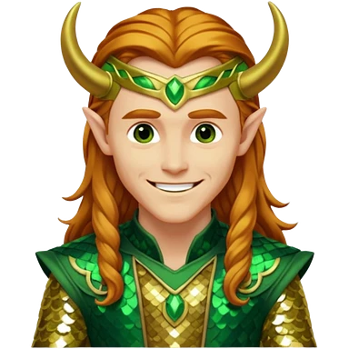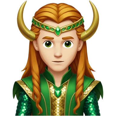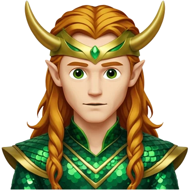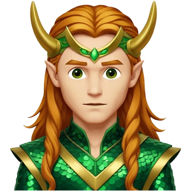 Loki, God of Mischief from Gods and Goddesses with long reddish blonde hair, green and gold sequin outfit emoji