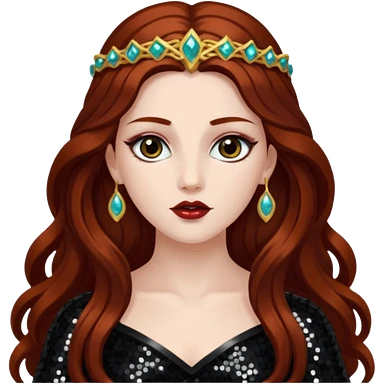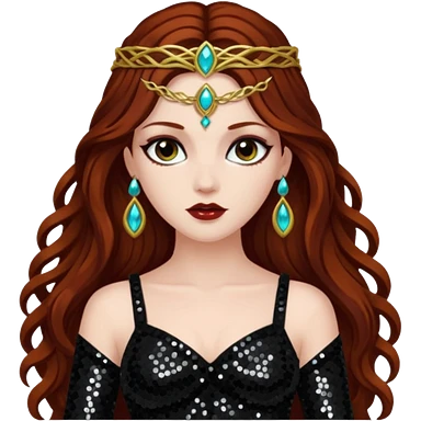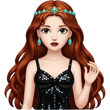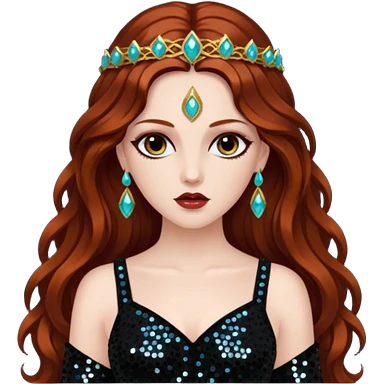 Persephone, Goddess of Death from Gods and Goddesses with long dark auburn hair, black sequin outfit emoji
