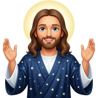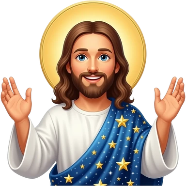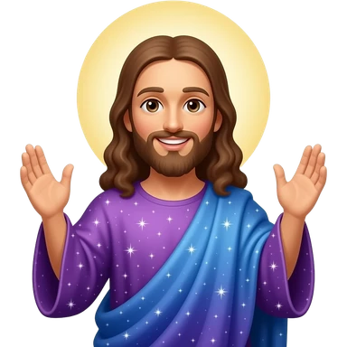 Jesus smiling and wearing a night sky robe and a halo behind him and hands risen up emoji