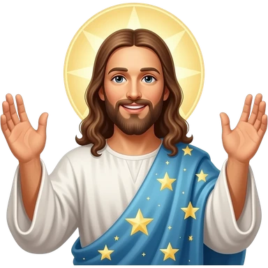 Jesus smiling and wearing a starry celestial robe and a halo behind him and hands risen up emoji