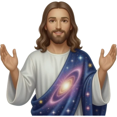 Jesus smiling and wearing a galaxy celestial robe and a halo behind him and hands risen up emoji