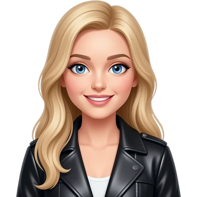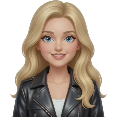 jeune femme blonde, yeux bleus, sourire, rêveuse, cheveux longs très lisses, belle, manteau cuir élégant emoji