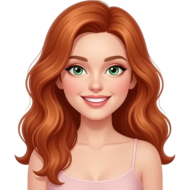 jeune femme rousse, yeux verts, cheveux longs ondulés, grand sourire charmeur, maquillage, botox, camisole emoji