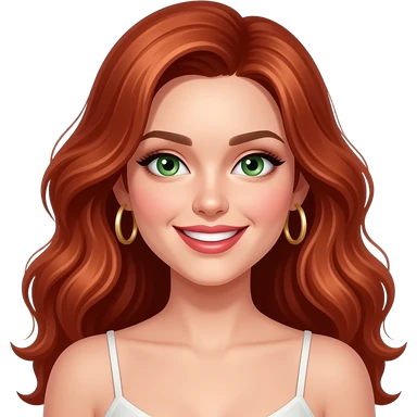 jeune femme rousse, yeux verts, cheveux très longs ondulés, grand sourire charmeur, maquillage, botox, camisole, anneaux dorés aux oreilles emoji