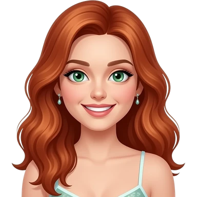 jeune femme rousse, yeux verts, cheveux très longs ondulés, grand sourire charmeur, maquillage, botox, camisole, anneaux aux oreilles emoji