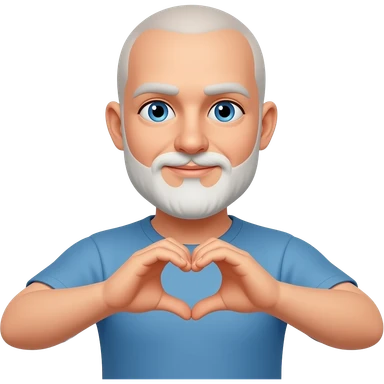 Homme jeune barbe blanche sans cheveux, yeux bleus qui fait le signe coeur emoji