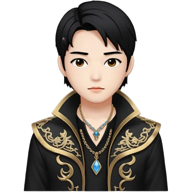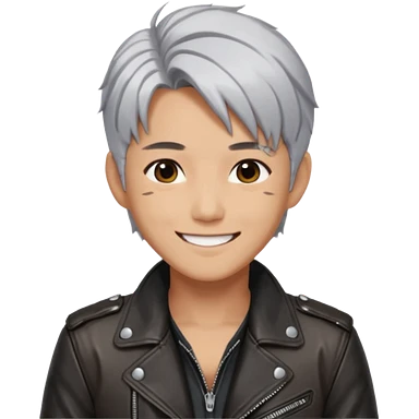 A handsome man with fair complexion. masculine, roman, slightly crooked nose. Thick triangular eyebrows. Hooded eyes and black pupils. smily lips with a heavy top lid. Jinu haircut emoji