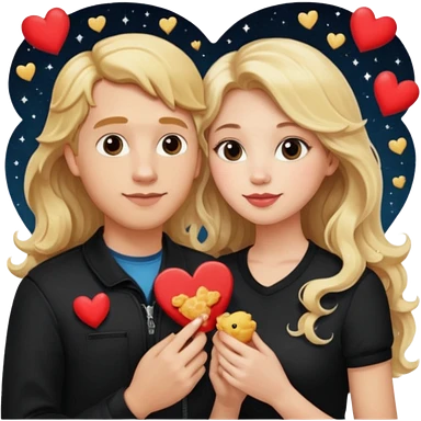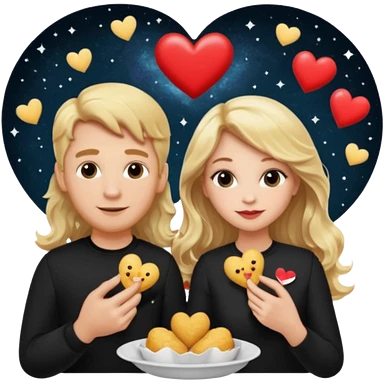 Couple with blonde hair wearing black eating chick filet hearts and outer space in the background. The girl has long wavy hair . emoji