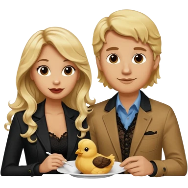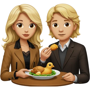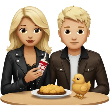 Love tan woman long wavy blonde hair and black lace with a white man short spiked blonde hair wearing Brown jacket eating chick filet emoji