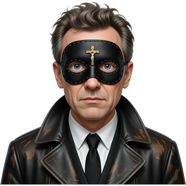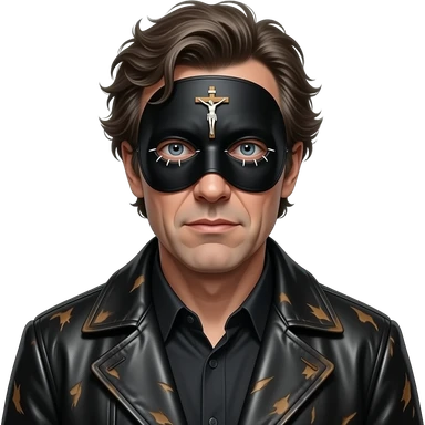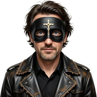 portrait of Joel-Peter Witkin, an American photographer known for his provocative and controversial works, he wears a small black mask with a crucifix over his eyes: a small crucifix is sewn onto the black mask between the eyes of the portrait, he wears a worn leather coat and very disheveled hair emoji