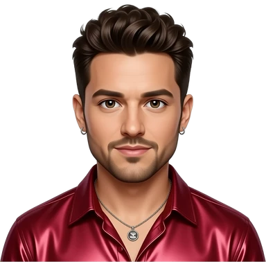 Joey Fatone from NSYNC with brown eyes, dark brown 90s pineapple hair and short beard, ruby red metallic shirt, necklace and earrings emoji