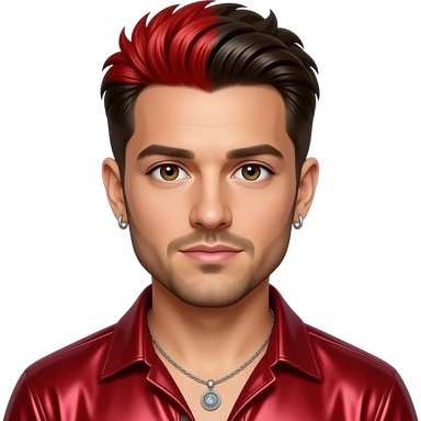 Joey Fatone from NSYNC with brown eyes, dark brown 90s pineapple hair with bright red-dyed and short beard, ruby red metallic shirt, necklace and earrings emoji