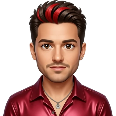 Joey Fatone from N'Sync with brown eyes, dark brown hair with red dyed, ruby red metallic shirt, silver necklace and short earrings emoji