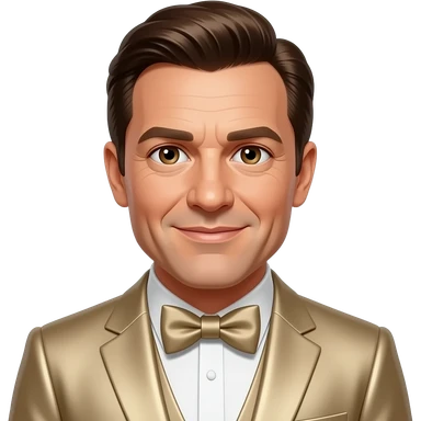 John Saxon with brown eyes, dark brown hair, beige metallic suit with bow tie emoji