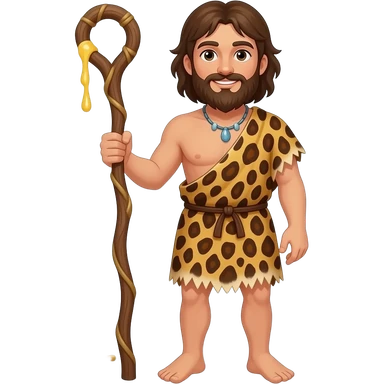 John the Baptist full bodied man with a beard and primitive look, dressed in wild animal prints, holding a staff and has wild honey and grasshoppers with him for eating emoji