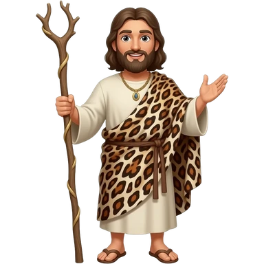 John the Baptist full bodied man with a beard and primitive look, dressed in wild animal prints and robes , holding a staff preaching about Jesus emoji