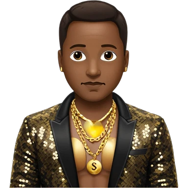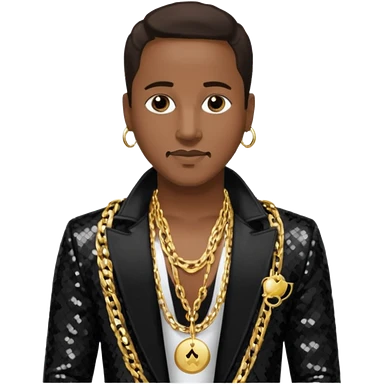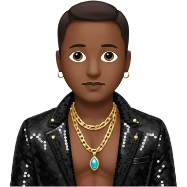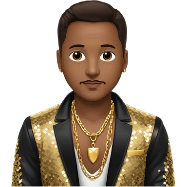 Johnny Gill with dark brown hair, black sequin jacket, shirtless with necklace emoji