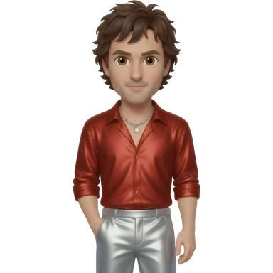 Johnny Knoxville with brown eyes, dark brown hair, red metallic shirt, white metallic baggy pants, silver necklace emoji