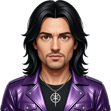 Jonathan Davis with dark brown eyes, long dark brown hair, purple metallic shirt, silver necklace emoji
