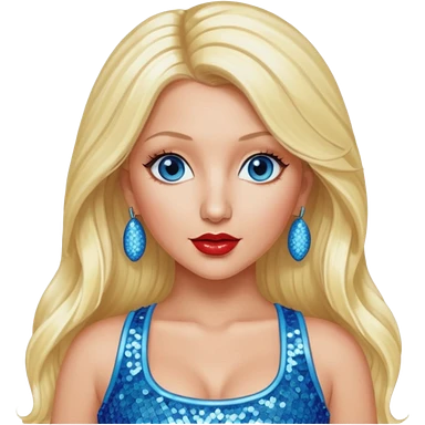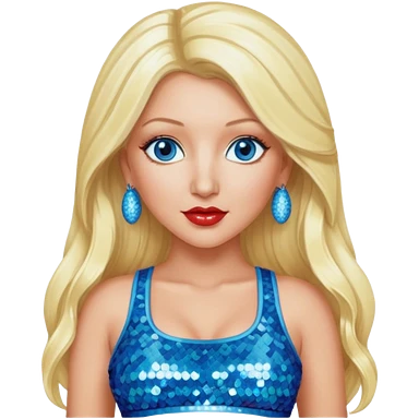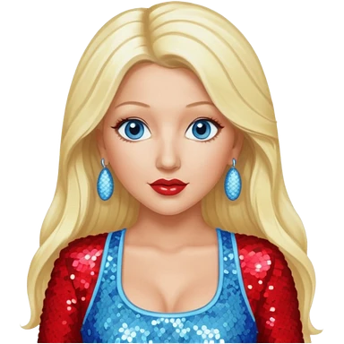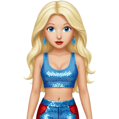 Christina Aguilera with blue eyes, long blonde hair, light blue sequin crop top, red sequin pants emoji