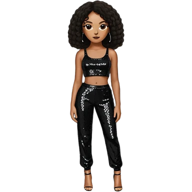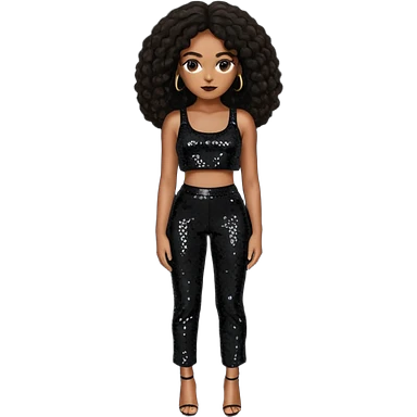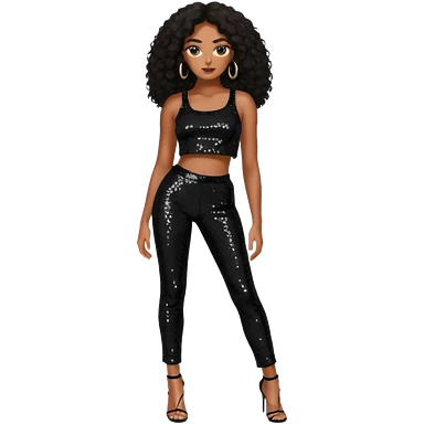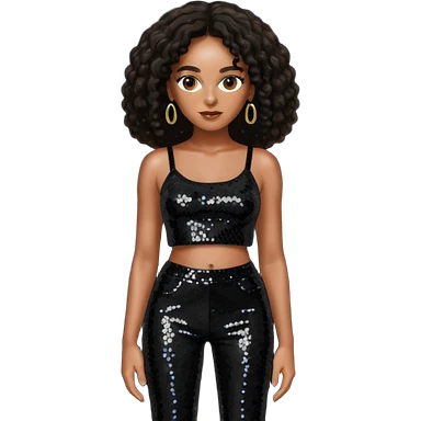 Solange with long dark brown hair, black sequin crop top, black sequin pants emoji