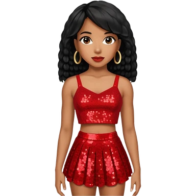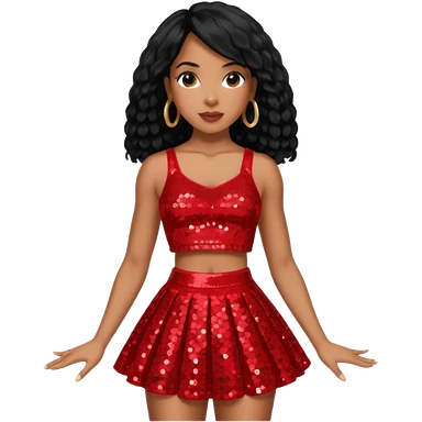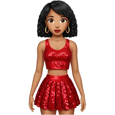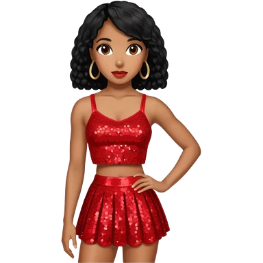 Kelly Rowland with black hair, red sequin crop top and skirt emoji