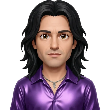 Jonathan Davis with brown eyes, long black hair, purple metallic shirt, silver necklace emoji