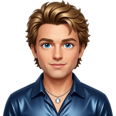 Joey McIntyre from NKOTB with blue eyes, golden brown 90s feathered layer hair, dark blue metallic shirt, necklace emoji
