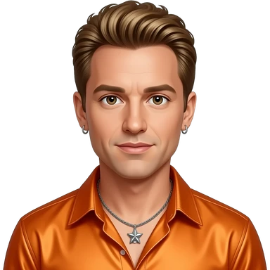 Donnie Wahlberg from NKOTB with brown eyes, golden brown 90s mullet hair, orange metallic shirt, necklace and earrings emoji