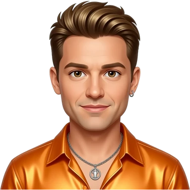 Donnie Wahlberg from NKOTB with brown eyes, golden brown hair, orange metallic shirt, white metallic baggy pants, silver necklace emoji