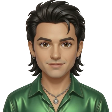 Danny Wood from NKOTB with dark brown eyes, black 90s mullet hair, green metallic shirt, necklace and earrings emoji