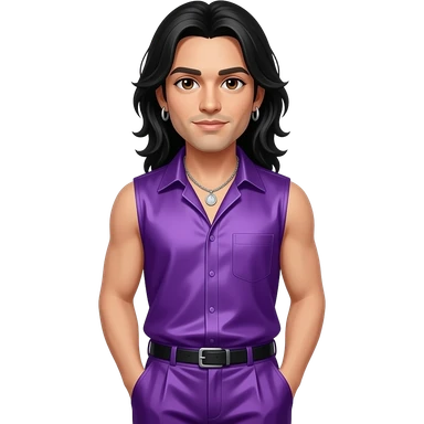 Jonathan Davis with brown eyes, long black hair, purple silk sleeveless shirt, purple silk baggy pants, necklace and earrings emoji