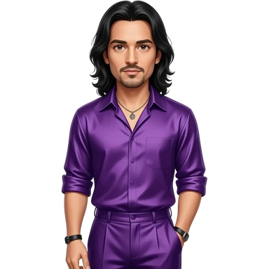 Jonathan Davis with brown eyes, long black hair, purple silk shirt, purple silk baggy pants, necklace emoji