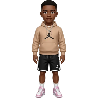 make a black 22 year old with a low taper fade in black jordan shorts with light pink jordan 4’s and a tan jordan saeatshirt with a thin diamond chain emoji