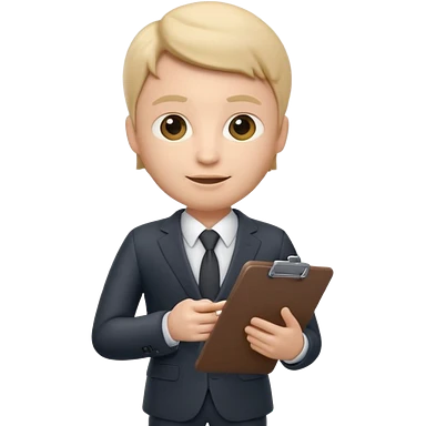 Apple Memoji-style 3D emoji of a manager character in a suit holding a clipboard, soft shading, rounded shapes, clean gradients, no background. emoji