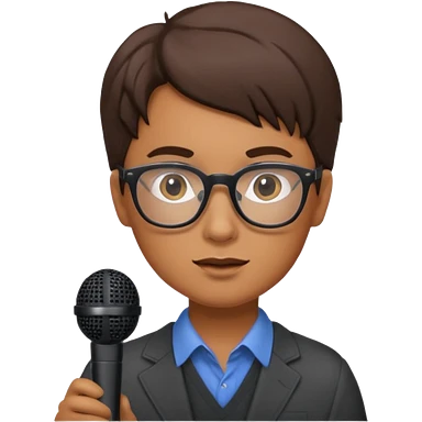 Apple Memoji-style 3D emoji of a journalist holding a microphone and notepad, smooth gradients, rounded shapes, no background. emoji