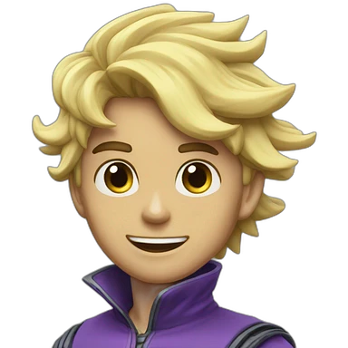 Dio Brando from "JoJo's Bizarre Adventure: Stardust Crusaders" has long blond hair, piercing eyes, and a sharp, angular face. He is tall and muscular, often seen wearing a flamboyant yellow outfit with green motifs and a headband. emoji