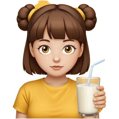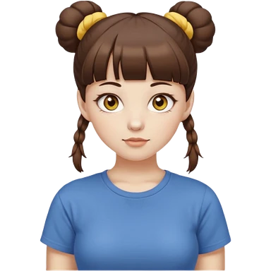 beautiful girl with brown hair with twin buns style, straight bangs, yellow eyes, milk brown tshirt, white skin, her body is a little fat emoji