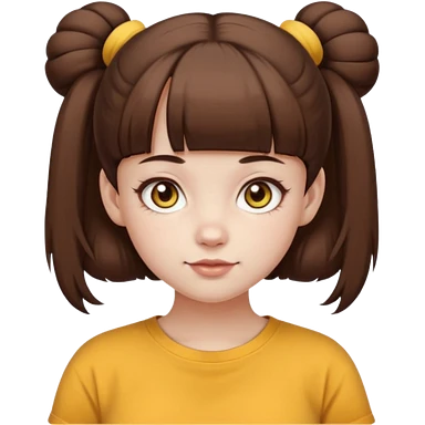 beautiful girl with brown hair with up twin buns style only, straight bangs, yellow eyes, milk brown tshirt, white skin, her body is a little fat emoji