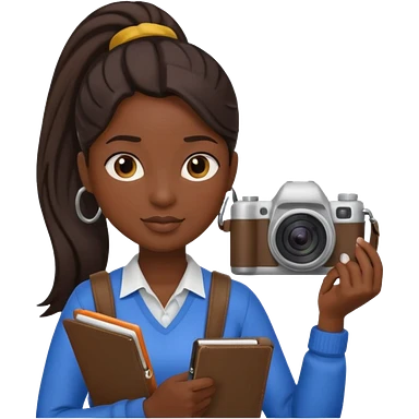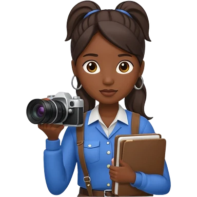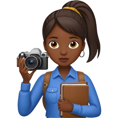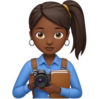 journalist dark skin woman ponytail holding camera and notebook emoji